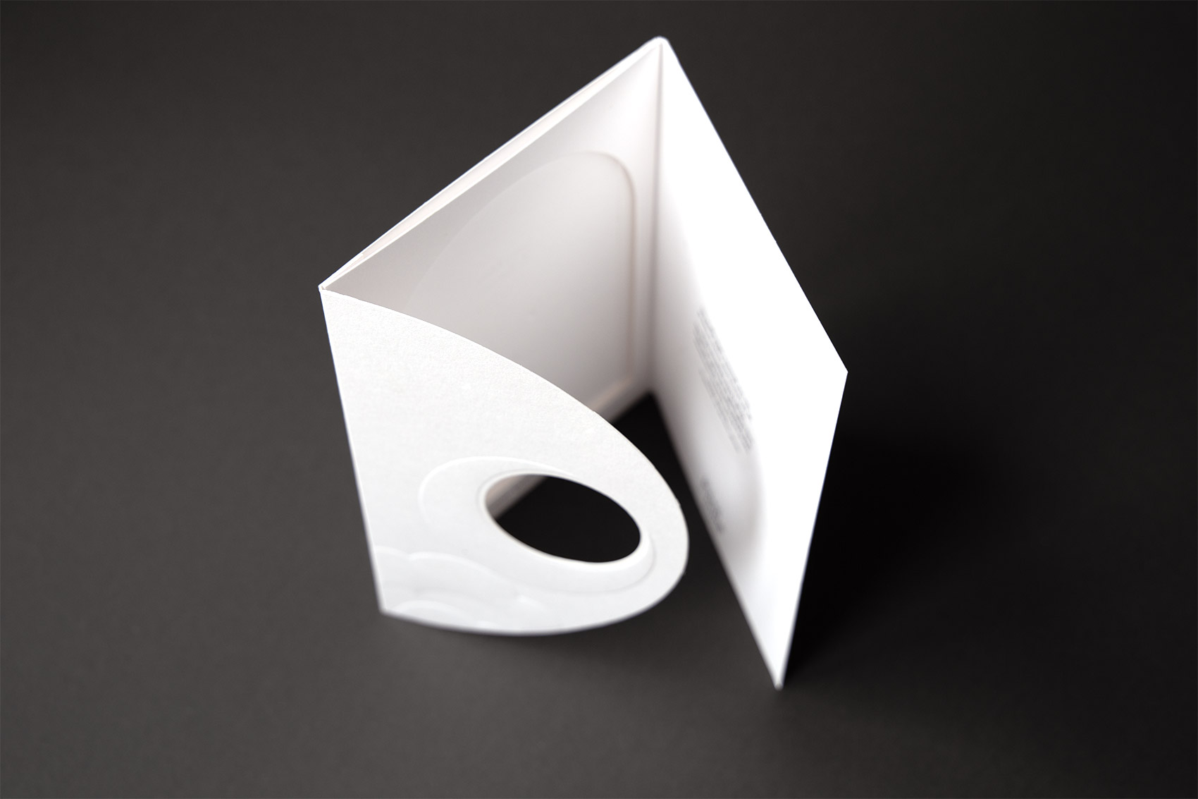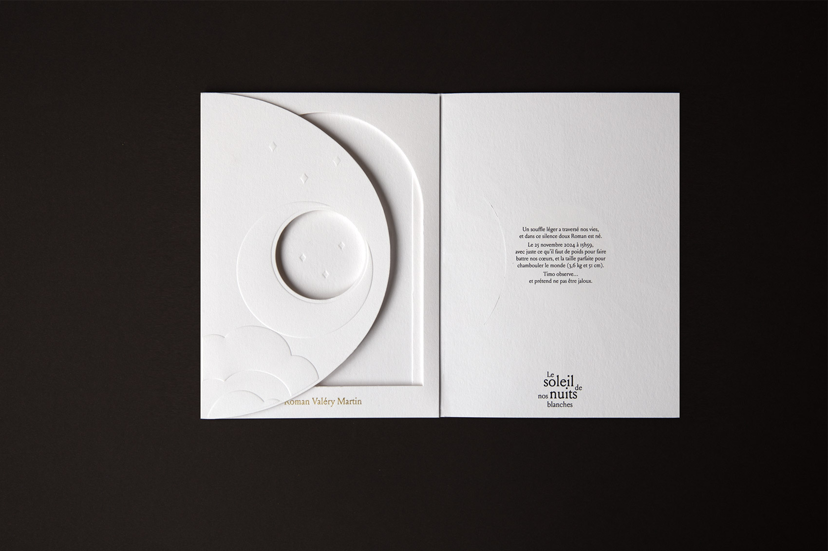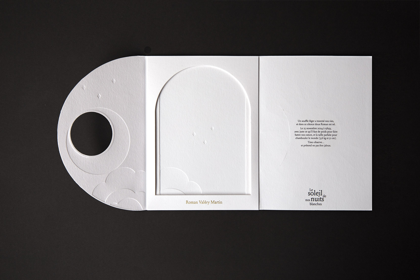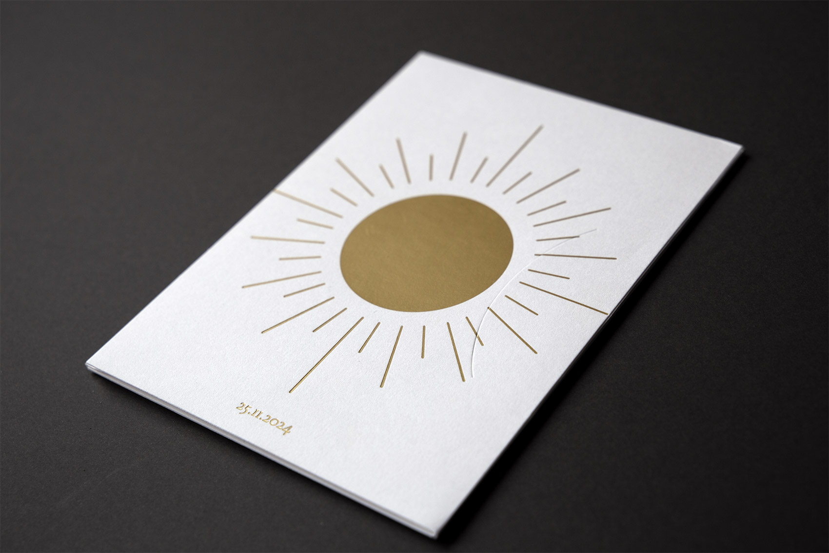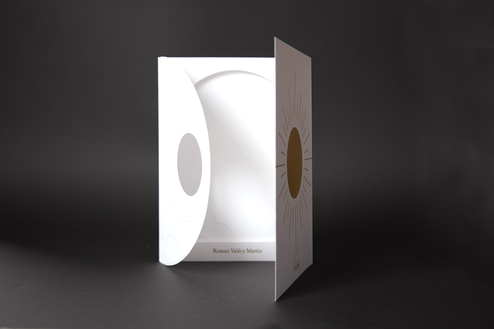 Impression or à chaud, gaufrage, sérigraphie noire et découpe sur Gmund Coton.